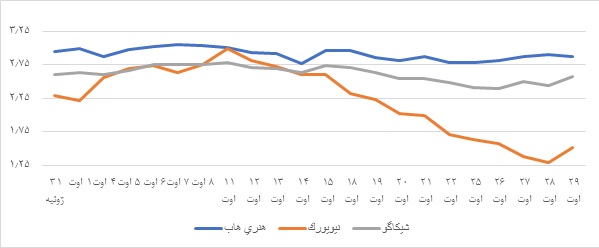 شکل 1: روند تغييرات قيمت های تك محموله گاز طبيعي بازار آمريكا طي دوره 31 ژوئیه الي 29 اوت 2025- (دلار در هر ميليون بي.تي.يو)