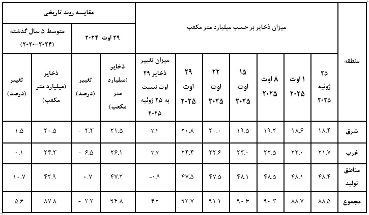 در منطقه شرق، ميزان ذخاير طي هفته منتهي به 29 اوت 2025 نسبت به هفته منتهی به 25 ژوئیه 2024 به ميزان 2.4 ميليارد متر مكعب افزایش يافته و در سطح 20.8 ميليارد متر مكعب قرار گرفته است و به ميزان 0.3 ميليارد متر مكعب (1.5 درصد) بیشتر از متوسط 5 سال گذشته اين منطقه مي باشد. ميزان متوسط ذخاير زير زميني گاز طبيعي در شرق آمريكا در زمان مشابه طي 5 سال گذشته در حدود 20.5 ميليارد متر مكعب بوده است.