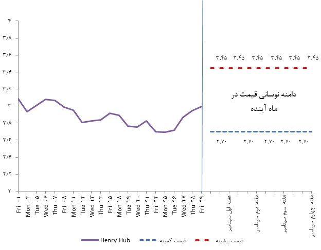 قيمت آتي هاي گاز طبيعي در بازار بورس آمريكا (آتي هاي ماه اول) طي دوره 1 اوت الي 29 اوت 2025 از يك روند نزولی همراه با نوسان برخوردار بود و از حدود 3.08 دلار در هر میلیون بیتییو در تاریخ 1 اوت 2025 تا حدود 3.00 دلار در هر میلیون بیتی یو در تاریخ 29 اوت کاهش یافت. کمترین مقدار آن در 22 و 25 اوت (2.70 دلار در هر میلیون بیتییو) و بیشترین مقدار آن در 1 و 6 اوت (3.08 دلار در هر میلیون بیتییو) بود.