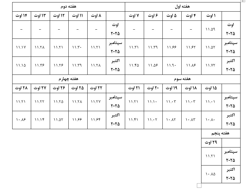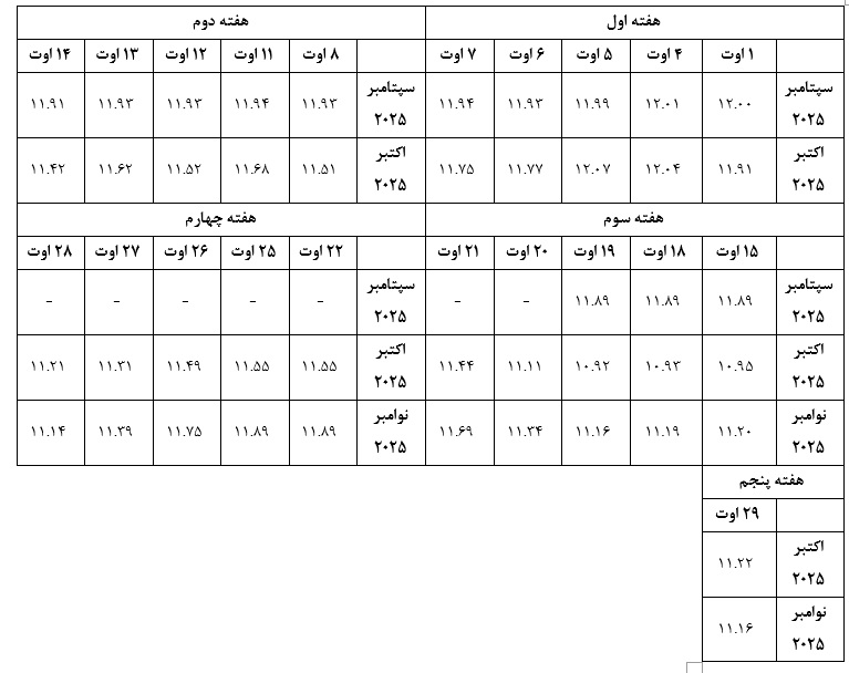 در جدول زیر قيمت آتي هاي گاز طبيعي درTTF هلند، برای تحویل در ماه اوت، سپتامبر و اکتبر 2025، نشان داده شده است.
