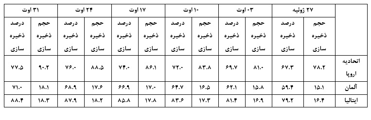 جدول 6: روند تغييرات سطح ذخیره سازی گاز طبيعي اتحادیه اروپا و کشورهای منتخب طي هفته منتهی به 31 اوت 2025