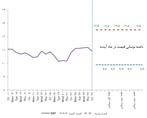 قيمت آتی های گاز طبيعي در بازار اروپا (NBP) طي یک ماه گذشته از یک روند نوسانی برخوردار بوده و از حدود 11.06 دلار در هر میلیون بیتییو در تاریخ 1 اوت 2025 تا 10.92 دلار در هر میلیون بیتی یو در تاریخ 29 اوت 2025 کاهش یافت. کمترین مقدار آن در 19 اوت (10.17 دلار در هر میلیون بیتییو) و بیشترین مقدار آن در 28 اوت (11.20 دلار در هر میلیون بیتییو) بود.
