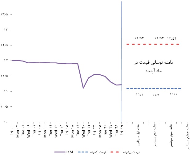 قيمت آتیهای الانجی در بازار ژاپن/ کره طي ماه گذشته از یک روند نزولی همراه با نوسان برخوردار بوده و از حدود 12.00 دلار در هر میلیون بیتییو در تاریخ 1 اوت 2025 تا 11.22 دلار در هر میلیون بیتی یو در تاریخ 29 اوت 2025 کاهش یافت. کمترین مقدار آن در 20 اوت (11.11 دلار در هر میلیون بیتی یو) و بیشترین مقدار آن در 1 اوت (12.00 دلار در هر میلیون بیتی یو) بود.